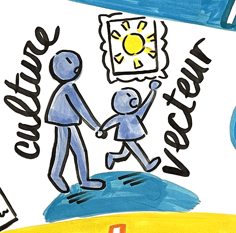 The graphic recordings I create are a mix of words and images. A kind of visual notetaking. I like to use colors to connect ideas and highlight keywords. As an illustrator and comic book artist, I believe that images can say a lot. Characters and symbols catch our eye and set the tone. I also like to illustrate certain memorable anecdotes shared during the activities: even if people who weren’t there may not fully understand the reference, I think it keeps the memory of the moment alive for those who were there!