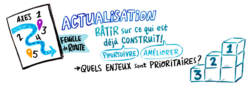 Here is what I wrote in 2019 about graphic recording: « …you’re put at the center of a discussion. You must think, listen and understand what’s going on to put it on the wall. » I feel the same way today! These projects take me out of my literature-related work environment and put me in a learning situation in a variety of fields: community sector, immigration, education, economic and cultural infrastructure… It’s very interesting! I think I leave these gigs with added knowledge and, I hope, a sensitivity that serves me well in my other tasks.