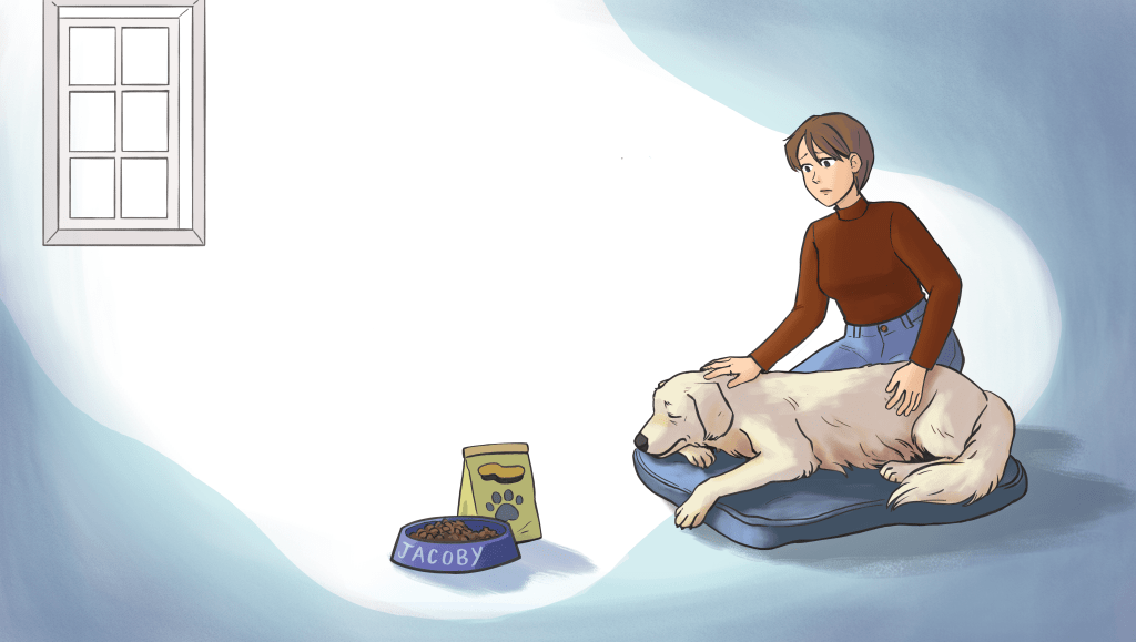 « Jacoby, qui a aidé de nombreux enfants à gérer leur anxiété et les a encouragés à lire, est très malade. Devant sa douleur, Madame Ève se résoud à l’emmener chez la vétérinaire pour le faire euthanasier.